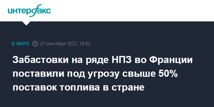 Москва. 27 сентября. INTERFAX.RU - Рабочие четырех нефтеперерабатывающих заводов во Франции вышли на забастовку, в результате чего под угрозой оказалось более половины поставок топлива в стране.