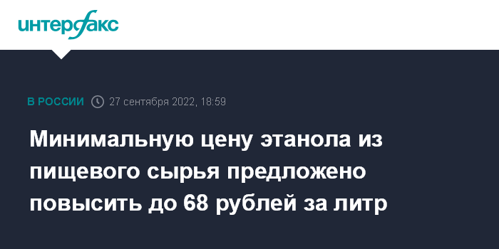 Москва. 27 сентября. INTERFAX.RU - Минфин предлагает с 1 января 2023 года повысить до 68 рублей минимальную цену за 1 литр этилового спирта из пищевого сырья. Проект такого приказа опубликован на портале проектов правовых актов. Цена указана без учета акциза и НДС.