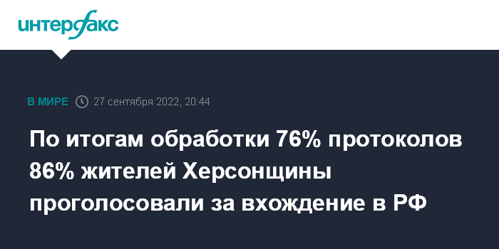 Москва. 27 сентября. INTERFAX.RU - Более 86% жителей Херсонской области проголосовали на референдуме за выход из состава Украины и присоединение региона к Российской Федерации, данные по результатам обработки 76% протоколов озвучила председатель областной избирательной комиссии Марина Захарова.