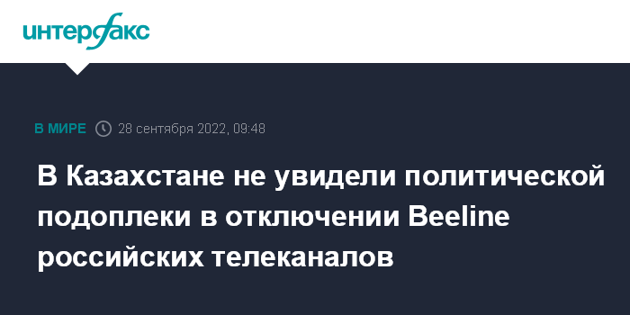 Казахстанский оператор связи Beeline прекращает трансляцию в республике ряда российских телеканалов с 5 октября. В частности, прекращается трансляция каналов: "Дом кино", "Победа", "О!", "Первый канал СНГ", "НТВ МИР", "Карусель International" (ВГТРК), "Россия 24" (ВГТРК), "Музыка Первого", "РТР Планета" (ВГТРК), "Время: далекое и близкое", "Телекафе", "Поехали", "Дом кино Premium HD", "Бобёр", "Россия К" (ВГТРК).