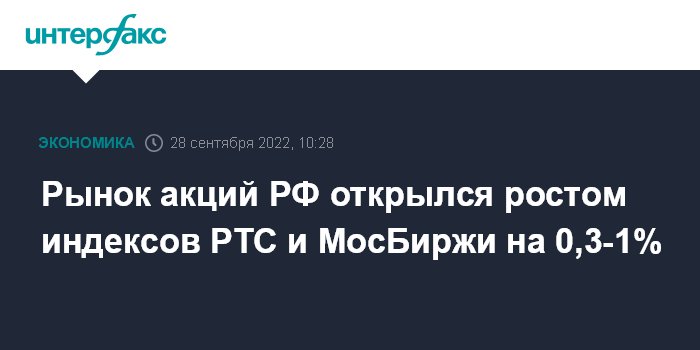 Москва. 28 сентября. INTERFAX.RU - Рынок акций РФ на старте торгов в среду сохранил восходящий импульс предыдущего дня, несмотря на очередное ухудшение внешней конъюнктуры и риски эскалации геополитической напряженности после прошедших референдумов в ряде областей Украины по присоединению к России; индексы РТС и МосБиржи за минуту торгов выросли на 0,3-1% во главе с бумагами финансовых компаний и металлургов на фоне ослабления рубля.