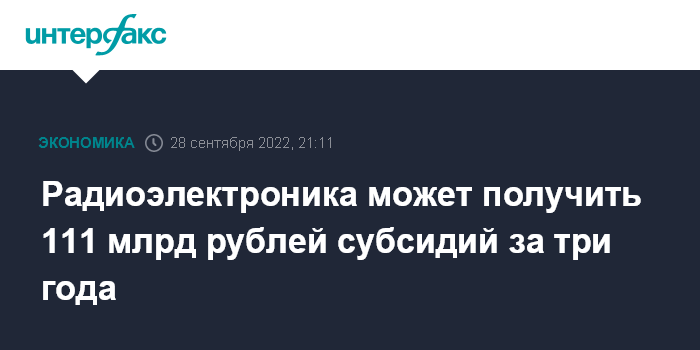 Москва. 28 сентября. INTERFAX.RU - Российская радиоэлектронная промышленность может получить в 2023-2025 годах субсидии из федерального бюджета в размере 111 млрд рублей, говорится в материалах/приложении к проекту бюджета на 2023-2025 годы, внесенному правительством в Госдуму.