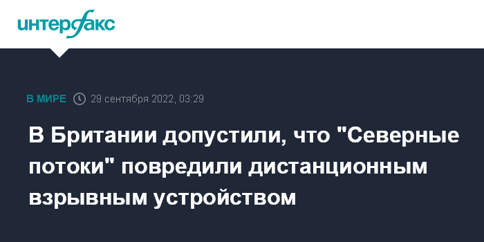 Москва. 29 сентября. INTERFAX.RU - Газопроводы "Северный поток-1" и "Северный поток-2", возможно, были повреждены с использованием взрывных устройств, приведенных в действие дистанционно, сообщает Sky News со ссылкой на источник в британском Минобороны.