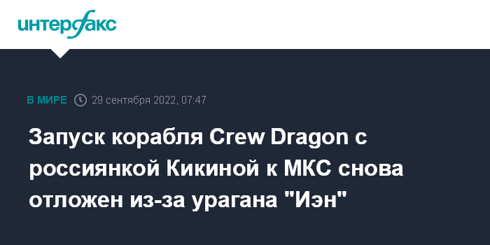 Москва. 29 сентября. INTERFAX.RU - Запуск миссии космического корабля компании SpaceX Crew Dragon-5 с космонавтом "Роскосмоса" Анной Кикиной к Международной космической станции (МКС) перенесен с 4 на 5 октября из-за урагана "Иэн", сообщили в NASA.