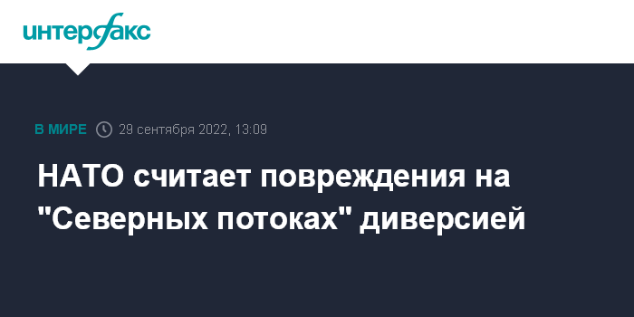 Москва. 29 сентября. INTERFAX.RU - НАТО считает, что диверсия стала причиной повреждения трубопроводов "Северный поток - 1" и Северный поток - 2", говорится в заявлении альянса.