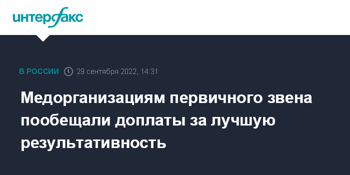 Москва. 29 сентября. INTERFAX.RU - Организации, оказывающие первичную медико-санитарную помощь, с 2023 года будут получать дополнительные деньги за лучшую результативность работы, сообщила директор департамента мониторинга, анализа и стратегического развития здравоохранения Минздрава Евгения Котова.
