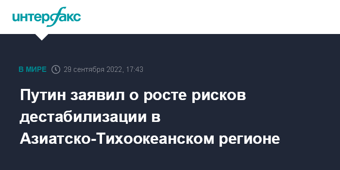 Москва. 29 сентября. INTERFAX.RU - Риски дестабилизации всего Азиатско-Тихоокеанского региона растут, заявил президент РФ Владимир Путин.