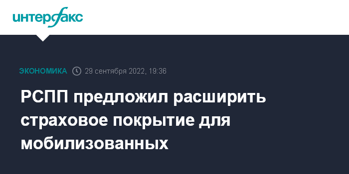В этой связи "РСПП предлагает Банку России рассмотреть возможность провести консультации со страховым сообществом и с учетом его мнения выступить с инициативой по внесению изменений в законодательство РФ, предусматривающих обеспечение страховой защиты мобилизованных граждан", говорится в сообщении.