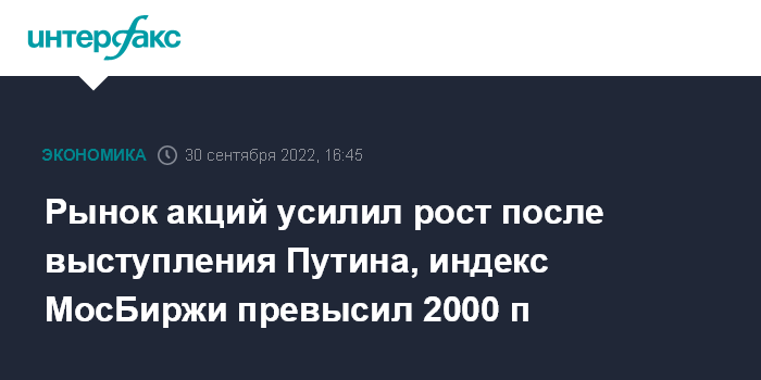 Москва. 30 сентября. INTERFAX.RU - Рынок акций РФ к вечеру в пятницу усилил рост после выступления президента РФ Владимира Путина и состоявшегося подписания в Кремле договоров о принятии в состав РФ четырех новых субъектов; индекс МосБиржи превысил рубеж 2000 пунктов
