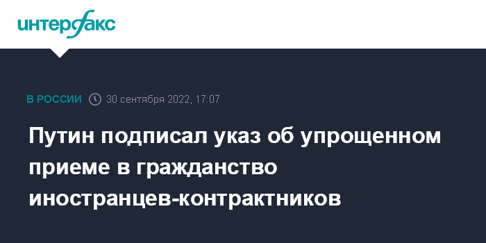 Москва. 30 сентября. INTERFAX.RU - Президент Владимир Путин подписал указ об упрощенном порядке приема в российское гражданство иностранцев и лиц без гражданства, заключивших контракты о прохождении военной службы в ВС России. Указ опубликован на официальном портале правовой информации.