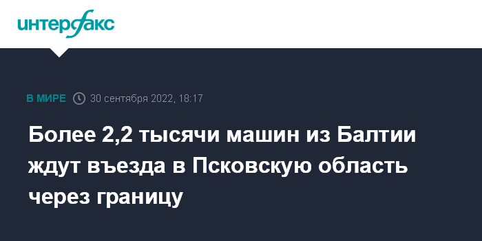 Москва. 30 сентября. INTERFAX.RU - На границе Псковской области более 2,2 тысячи легковых машин и грузовиков из Эстонии и Латвии стоят в очереди на въезд России, следует из данных Федеральной таможенной службы.