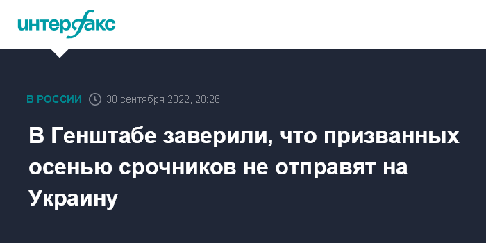 Москва. 30 сентября. INTERFAX.RU - Срочники, которых призовут на службу осенью 2022 года, не будут отправлены в зону проведения специальной военной операции, а после окончания службы их направят к местам проживания, заявил замначальника главного организационно-мобилизационного управления Генштаба Владимир Цимлянский.