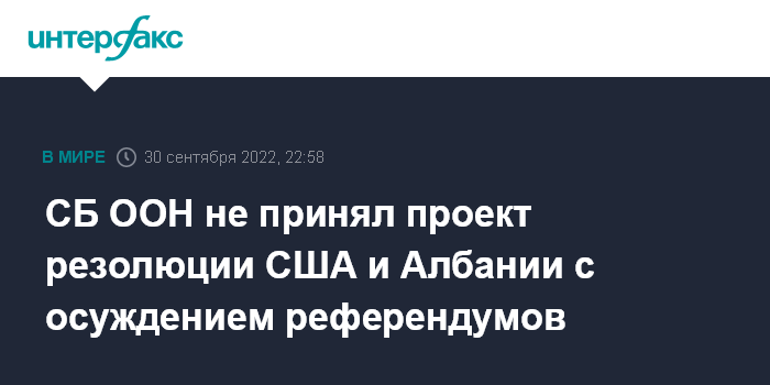 Москва. 30 сентября. INTERFAX.RU - Россия заветировала в СБ ООН проект резолюции США и Албании с осуждением решения о присоединении к России Донецкой и Луганской народных республик, а также Херсонской и Запорожской областей.