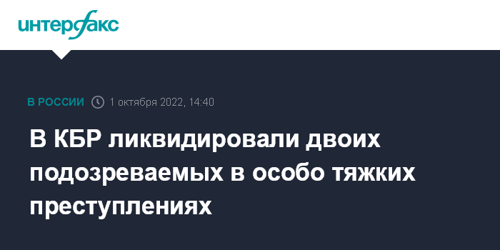 Москва. 1 октября. INTERFAX.RU - В Кабардино-Балкарии ликвидированы двое подозреваемых в особо тяжких преступлениях, открывших стрельбу по полицейским, сообщила в субботу официальный представитель МВД России Ирина Волк.