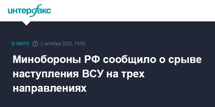 Москва. 2 октября. INTERFAX.RU - Вооруженные силы Украины (ВСУ) попытались наступать одновременно на Николаевском, Андреевском и Криворожском направлениях, сообщил официальный представитель министерства обороны РФ Игорь Конашенков на брифинге в воскресенье.