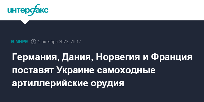 Москва. 2 октября. INTERFAX.RU - Берлин, Копенгаген, Осло и Париж окажут Киеву военную помощь артиллерийскими орудиями, сообщила в воскресенье Le Figaro.