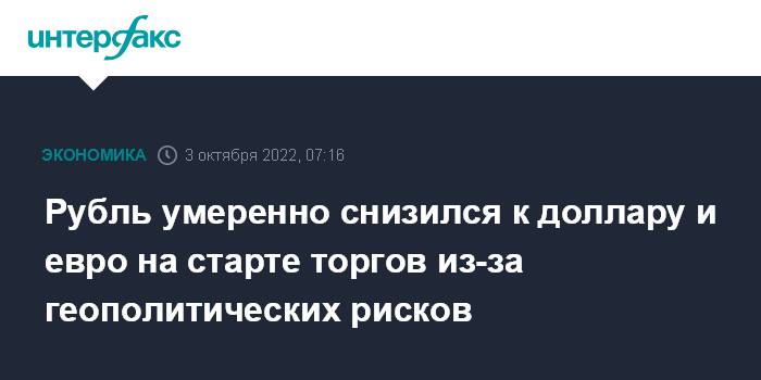 По мнению экспертов "Интерфакс-ЦЭА", рубль на старте торгов в понедельник демонстрирует снижение к основным валютным парам после завершения налогового периода, во время которого поддержку нацвалюте оказывали продажи валютной выручки экспортерами. На первый план вышли геополитические и санкционные риски. Кроме того, начало торгов шло в условиях неопределенности на мировых рынка капитала. В целом сохраняются опасения начала рецессии мировой экономики вследствие ужесточения денежно-кредитной политики (ДКП) крупнейшими центробанками мира для борьбы с рекордной инфляцией. Цены на нефть растут, но не исключено, что рубль продолжил отыгрывать заметное падение мировых цен на нефть в конце минувшей недели.