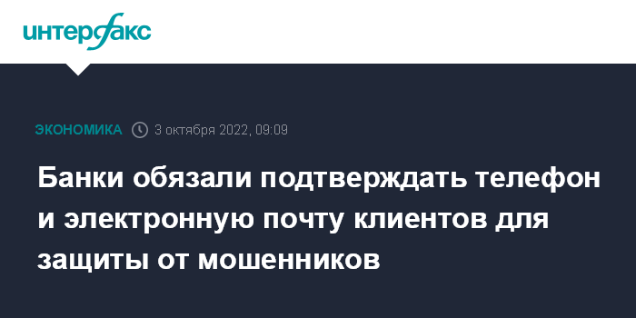 Москва. 3 октября. INTERFAX.RU - Банки с 1 октября этого года для защиты клиентов от действий кибермошенников обязаны идентифицировать устройства, с которых граждане проводят онлайн-операции, а также подтверждать их телефонные номера и адреса электронной почты.