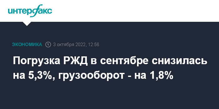 Москва. 3 октября. INTERFAX.RU - В сентябре 2022 года погрузка на сети ОАО "РЖД" составила 100,8 млн тонн, что на 5,3% меньше, чем в сентябре 2021 года, сообщила компания.