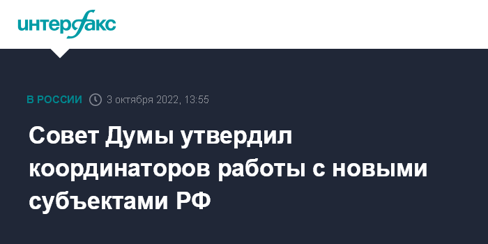 Москва. 3 октября. INTERFAX.RU - Совет Думы в понедельник определил депутатов, которые будут координировать работу с новыми субъектами РФ: ЛНР, ДНР, Запорожской и Херсонской областей.