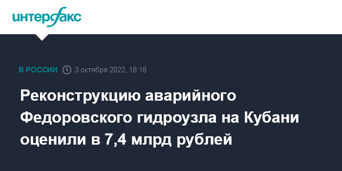 Реконструкцию аварийного Федоровского гидроузла на Кубани оценили в 7,4 млрд рублей