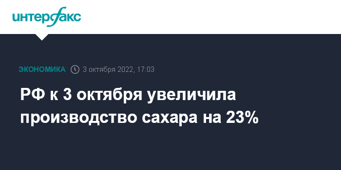 Москва. 3 октября. INTERFAX.RU - Сахарные заводы РФ к 3 октября выработали 1,66 млн тонн свекловичного сахара, что на 23% больше, чем годом ранее, сообщает Евразийская сахарная ассоциация.
