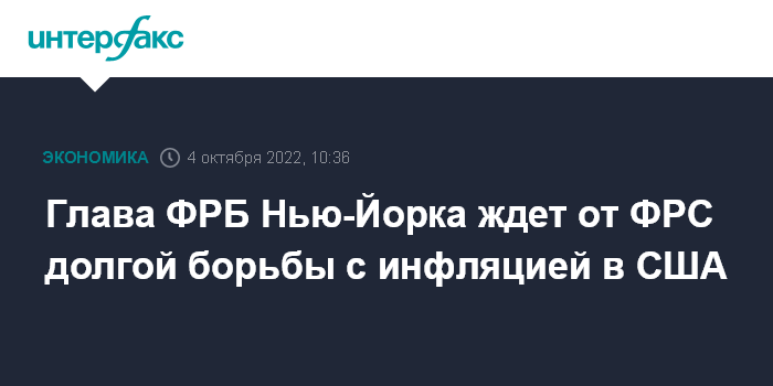 Глава ФРБ Нью-Йорка ждет от ФРС долгой борьбы с инфляцией в США
