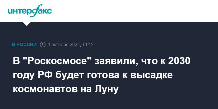 Москва. 4 октября. INTERFAX.RU - К 2030 году Россия технологически будет готова к высадке космонавтов на Луну, сообщил глава "Роскосмоса" Юрий Борисов.