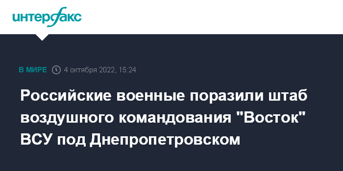 "На юго-западной окраине Днепропетровска высокоточным ударом ВКС России поражен штаб воздушного командования "Восток" ВСУ", - сказал официальный представитель Минобороны РФ Игорь Конашенков на брифинге во вторник.