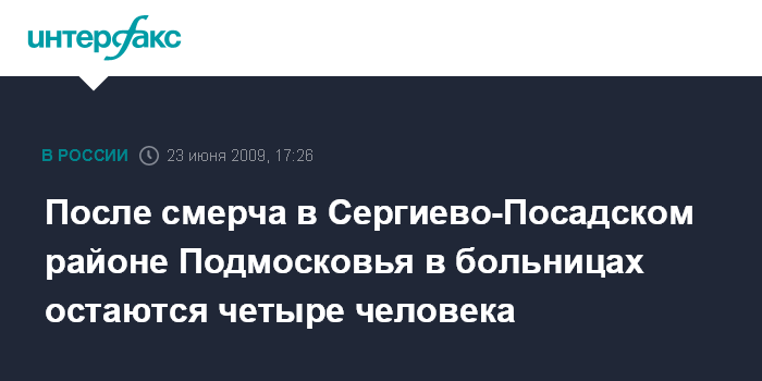 Москва. 23 июня. INTERFAX.RU - После смерча, который прошел 3 июня в городе Краснозаводске Сергиево-Посадского района Московской области, в больницах остаются четыре человека - трое мужчин и одна женщина, сообщил во вторник на пресс-конференции глава района Владимир Коротков. По его данным, в результате смерча за медицинской помощью обратились 62 человека, госпитализированы 14 человек, из которых трое были направлены в реанимацию.