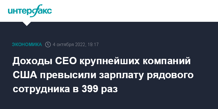 В результате зарплаты CEO теперь превышают средний уровень оплаты труда рядового сотрудника почти в 399 раз, что является рекордом, говорится в сообщении некоммерческого американского аналитического центра. Предыдущий максимум, когда зарплата CEO превышала доход рядового сотрудника в 393 раза, был зафиксирован в 2000 году.
