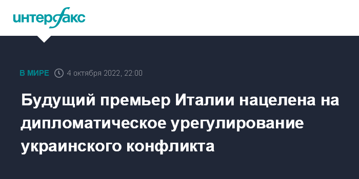 Москва. 4 октября. INTERFAX.RU - Лидер партии "Братья Италии" Джорджа Мелони, которая в ближайшее время займет пост премьера, заявила по телефону президенту Украины Владимиру Зеленскому, что нацелена на дипломатическое урегулирование украинского конфликта.