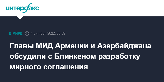 Москва. 4 октября. INTERFAX.RU - Главы МИД Армении и Азербайджана Арарат Мирзоян и Джейхун Байрамов и госсекретарь США Энтони Блинкен в ходе телефонного разговора во вторник обсудили разработку мирного соглашения между Ереваном и Баку.