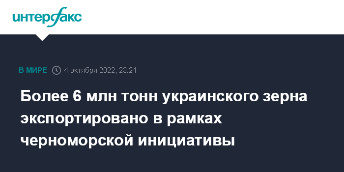 "По состоянию на 4 октября общий тоннаж зерна и другой агропродукции, экспортированных из трех украинских портов, составляет 6 120 248 тонн. Всего на данный момент было разрешено движение 561 сухогруза - 293 на прибытие в украинские порты и 268 - на выход из них", - сообщили в СКЦ.