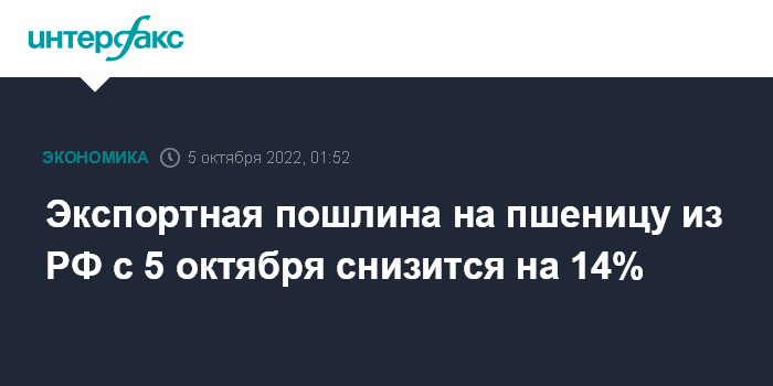 Экспортная пошлина на пшеницу из РФ с 5 октября снизится на 14%
