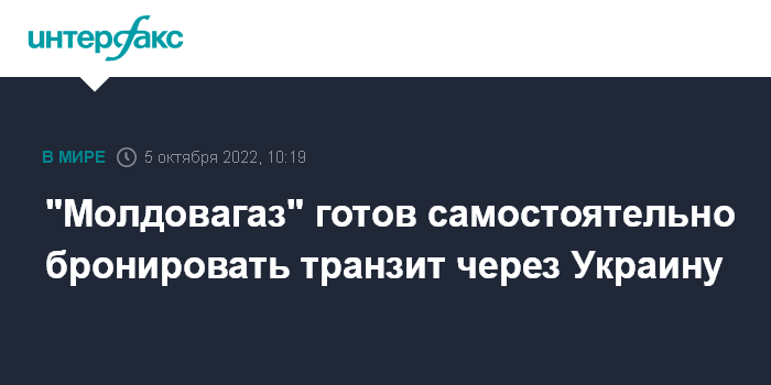 Москва. 5 октября. INTERFAX.RU - Компания "Молдовагаз" заявила о готовности самостоятельно бронировать транзит через Украину необходимого ей объема газа от "Газпрома", говорится в сообщении, опубликованном в среду на сайте национального газового оператора Молдавии.
