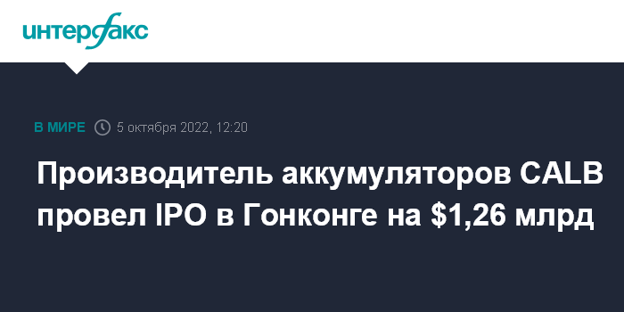 Москва. 5 октября. INTERFAX.RU - Китайский производитель литиевых аккумуляторов CALB провел IPO в Гонконге, разместив акции на сумму 9,86 млрд гонконгских долларов ($1,26 млрд).
