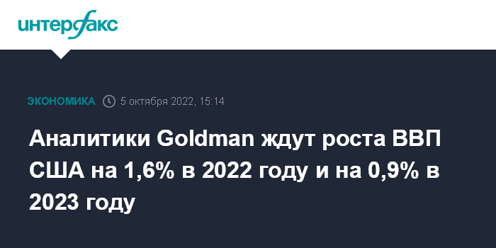 Москва. 5 октября. INTERFAX.RU - Аналитики Goldman Sachs прогнозируют замедление темпов роста ВВП США в 2023 году до 0,9% после подъема на 1,6% по итогам 2022 года. По их оценке, уровень безработицы вырастет до 4% с 3,6%, сообщает MarketWatch.