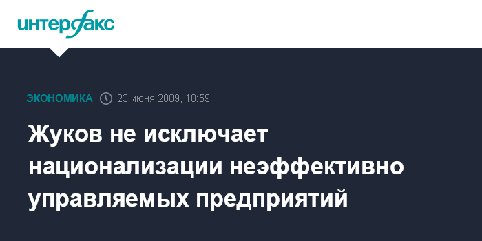 "Я считаю, что национализация предприятий, которые неэффективно управляются, в принципе возможна, но только как крайняя и временная мера", - заявил Жуков. По его словам эта мера может применяться выборочно, так как государство не в состоянии эффективно управлять большим количеством предприятий.