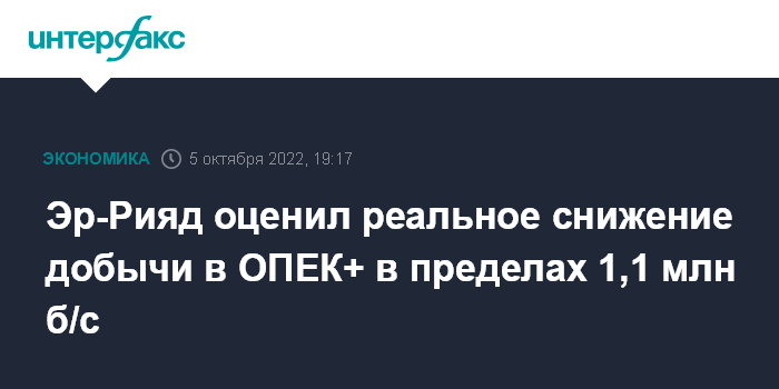 Эр-Рияд оценил реальное снижение добычи в ОПЕК+ в пределах 1,1 млн б/с