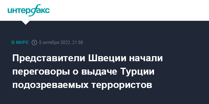Москва. 5 октября. INTERFAX.RU - Делегация из Минюста Швеции начала в Турции переговоры с турецкими чиновниками на предмет экстрадиции граждан, которых Анкара считает террористами, сообщает АР. По сведениям агентства, переговоры продолжатся 6 октября.