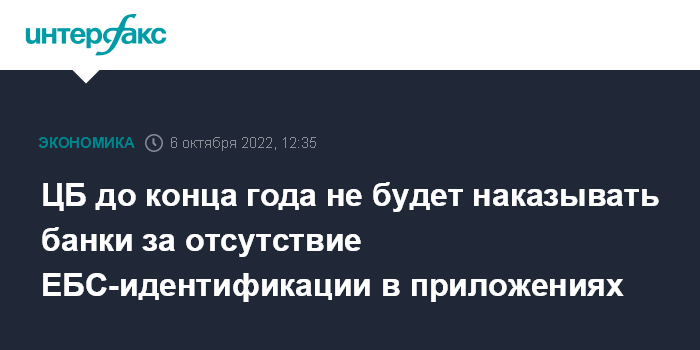 Москва. 6 октября. INTERFAX.RU - Банк России до конца 2022 года не будет применять меры воздействия к банкам, которые не внедрили в своих мобильных приложениях и на сайтах возможность открыть счет или вклад, а также получить кредит с использованием идентификации через Единую биометрическую систему (ЕБС), говорится в сообщении регулятора.