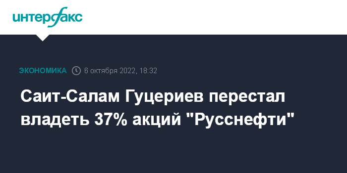Москва. 6 октября. INTERFAX.RU - Саит-Салам Гуцериев еще 21 июля перестал быть владельцем 37,145% акций "Русснефти", сообщила компания.
