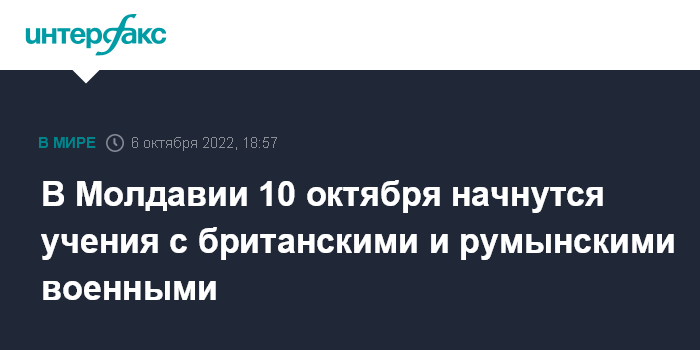 Москва. 6 октября. INTERFAX.RU - В Молдавии с 10 по 21 октября пройдут военные учения с участием военнослужащих Молдавии, Румынии и Великобритании. Об этом сообщила в четверг пресс-служба министерства обороны республики.