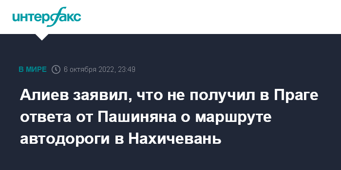Москва. 7 октября. INTERFAX.RU - Президент Азербайджана Ильхам Алиев заявил, что на встрече в Праге не смог получить ответа от премьер-министра Армении Никола Пашиняна о маршруте автомобильной дороги в рамках открытия коммуникаций.