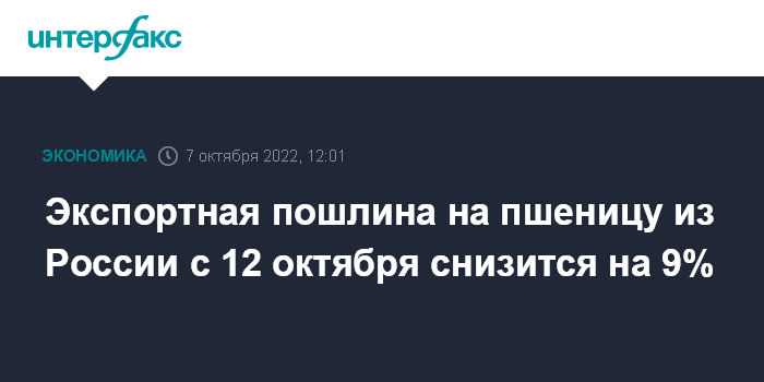 Москва. 7 октября. INTERFAX.RU - Экспортная пошлина на пшеницу из РФ с 12 октября снизится до 1 926,8 рубля с 2 119 рублей за тонну неделей ранее, сообщил Минсельхоз.