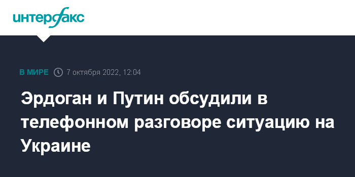 Москва. 7 октября. INTERFAX.RU - Президент Турции Реджеп Тайип Эрдоган в пятницу поговорил по телефону с президентом РФ Владимиром Путиным, лидеры страны обсудили события на Украине и двусторонние отношения, передают турецкие СМИ.