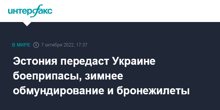 Москва. 7 октября. INTERFAX.RU - Министерство обороны Эстонии подготовило пакет военной помощи Украине, включающий артиллерийские и противотанковые боеприпасы, зимнее обмундирование и бронежилеты.