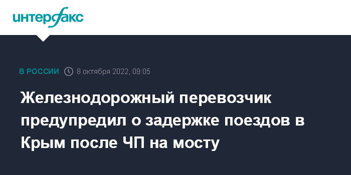 Москва. 8 октября. INTERFAX.RU - Поезда, направляющиеся в Крым из Москвы и Санкт-Петербурга, задерживаются из-за остановки движения по Крымскому мосту, сообщили в транспортной компании "Гранд Сервис Экспресс" (ГСЭ, Москва).
