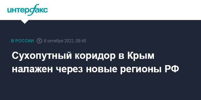 Москва. 8 октября. INTERFAX.RU - Сухопутный коридор в Крым, мост в который поврежден взрывом, налажен через новые регионы, сообщил советник главы Крыма Олег Крючков.